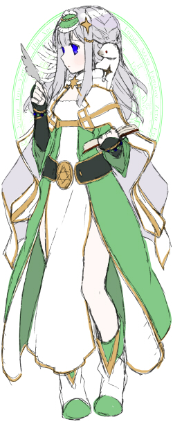 | 人物設定・容姿 | ○人物設定: セシリア騎士団領の水晶の都パレスのラーダ大神殿で「星詠の巫女」を勤めていたハイ・エルフです。 新王国歴260年頃、シームエンドの星屑の浜辺で魔導師でもあったラーダ司祭に拾われ、 その養女として瀑布の町クリナフォレンツァのラーダ神殿に幽閉され育てられました。 [→チェンジリング:エルフ(人間生まれ):魔法使い] 新王国歴300年頃、養父が亡くなり後任の司祭によりセシリア騎士団領の王都―――水晶の都パレスに送られ、 ラーダ大神殿の「星詠の巫女」として200年以上にわたって仕えてきました。 [→ 一般技能: オラクル技能(星詠みの巫女)5/ノーブル技能3] 新王国歴523年、パレスの都を襲撃したモルドレドの反乱軍によりラーダ大神殿で窮地に陥いりますが、 セシリア騎士の一人であるネモに、彼の命を引き換えにして救出されます。 その年の星光祭の夜に、 「ロードレス大陸に叡智を広め、未開の大陸を文明化せよ」 というラーダ神の御神託(クエスト)を授かり、ラーダ神殿での永い幽閉を解かれ、 ロードレス大陸のニューゲートの街までやってきました。 長く神殿に幽閉され世俗と隔離されて生きてきたため、年齢や経歴のわりに世間知らずです。 パレスからの長い船旅の末、自由都市ニューゲートには来たものの、早々に 「(パレスの高司祭にしたためてもらった)ラーダ神殿への紹介状」を失くしてしまい、 しばらく冒険者の宿(『ルージュのそよ風亭』)に長逗留して、遺跡調査や隊商護衛等の 冒険者稼業で生計を立てながら、賢者の学院での研究を続けていました。 524年、賢者の学院に所属する賢者/魔術師として、学院の寄宿舎に移り、研究と冒険を続けています。 527年7月、ニューゲートのラーダ神殿の司祭として正式に叙任され、学院の寄宿舎からラーダ神殿に移りました。 [→ プリースト技能:6] 現在も、賢者の学院の客員魔術師/冒険者として、遺跡探索も継続しています。 ○セッション参加回数:39回 (成功:37回/失敗:2回/1ゾロ:34回) ○近況報告 [新王国歴528年9月-530年1月]: @【セッション259G】から帰還しました。 A【セッション259F】から帰還しました。 B ミコちゃんに「銀細工のブレスレット」を持たせました。 毎晩、<ロケーション>の呪文による所在確認が新たな日課となっています。 ○パーソナル・クエスト: @ ラーダ神の神託にしたがい、未開の大地を文明化する。 A 古代王国の遺跡を保護し、古代の魔法文明を再興する。 ○容姿: @肩までとどく白銀色の髪、瑠璃色のアーモンド型の瞳、透き通るような白い肌。 Aエルフとしては小柄で、年齢に不相応な童顔です。 Bエルフ耳は、髪型や髪飾り等で隠しています(エルフの神官は奇異に見られることが多いため)。 Cラーダの聖印(星光)を模った髪飾りをつけ、軟革鎧の上に白い法衣(マント)を纏っています。 ○誕生日:7月7日 (ラーダ神を祀る星光祭の日) | |||