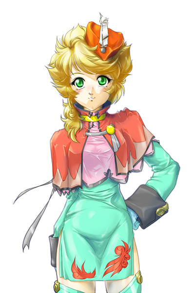 | 人物設定・容姿 | 身長:150cm 体重40kg B76 W56 H82 腰まで届く流れるような金髪に、引き込まれるような深い緑色の瞳を持つ少女。 胸が無いことを非常に気にしており、巨乳は敵だ!言ってはばからない。 しかし、風呂上りの豊胸体操、食事の後は牛乳を飲むなど大きくする努力はしている模様。 元々は護身術として細剣の訓練を積んでいたが、自分が殴られると痛いという単純にして明快な答えから、離れながら相手を攻撃することが出来る投げナイフの技術を習得。 両足首とスカートの中の太ももにシースケースを装備しており、そこからナイフを取り出す。が、見られるとキれる。 正々堂々?それって美味しいの?と、素で言い放つなど、「勝てば官軍」が信条であり、罠・毒も必要ならば使うことを厭わない。但し、そこに知識が追いついていないのが問題といえば問題 であるが。 イラストは和泉様にお願いいたしました。ありがとうございます | |||